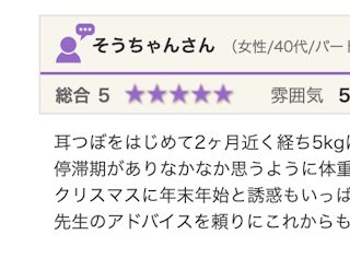 自分で色々ダイエットしたのですが、代謝も悪く痩せる事が出来なかったため、天使の耳さんにお世話になりました。 最初はなかなか結果が出せなかったのですが、 少しずつ身体に変化がありました。 結果、先生のサポートのおかげで、目標体重に近づく事が出...