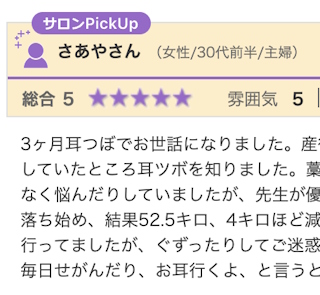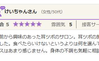 以前から興味のあった耳ツボのサロン。 耳ツボの施術に週一回お邪魔しています。 食事指導と耳ツボで、1ヶ月半で5kg痩せることができました。 食べたらいけないというよりは、何を選んで食べた方が良いかを教えてくれます。 食欲を抑える耳ツボのおか...