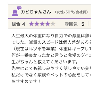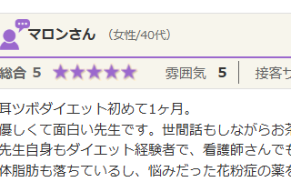 耳ツボダイエット初めて1ヶ月。 優しくて面白い先生です。 世間話もしながらお茶する感覚で楽しくダイエットに取り組めています(^^) 先生自身もダイエット経験者で、看護師さんでもあるので色々とアドバイスをもらえて心強いし、ダイエットが簡単に思...