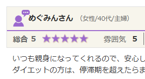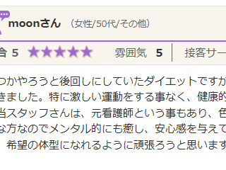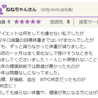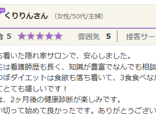 いつも親身になってくれるので、安心してお任せしてます。 ダイエットの方は、停滞期を超えたらまたスルスル痩せてきました! いま3か月目ですが、ストレスなくダイエットできています。