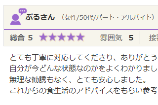 とても丁寧に対応してくださり、ありがとうございました。 自分が今どんな状態なのかをよくわかりました。 無理な勧誘もなく、とても安心しました。 これからの食生活のアドバイスをもらい、とても参考になりました。 もらったアドバイスを実践して、体に...