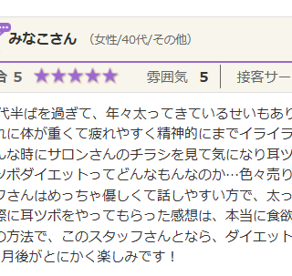 40代半ばを過ぎて、年々太ってきているせいもあり、どんなにおしゃれを頑張っても、イマイチ決まらなくなってきてる自分にイライラ… それに体が重くて疲れやすく精神的にまでイライラ。 そんな時にサロンさんのチラシを見て気になり耳ツボ体験に行ってみ...