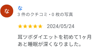 耳ツボは25年ほど前にやったことがありましたが、かぶれたり、違和感があったりとしました。 最初は半信半疑でしたが、通い始めてからはなんの抵抗もなく生活できています。 お風呂で耳を洗う際には要注意ですが、そういった注意事項を含めしっかりと説明...